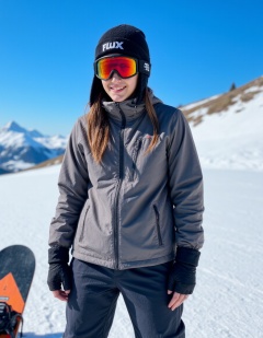 The image shows a person dressed in winter sports gear,including a black beanie with the word "FLUX" on it and a pair of goggles. happy,They are standing on a snowy landscape with a clear blue sky in the background. The person appears to be preparing for or taking a break from snowboarding,as suggested by the presence of a snowboard in the foreground. The overall scene conveys a sense of adventure and outdoor activity in a cold,mountainous environment,