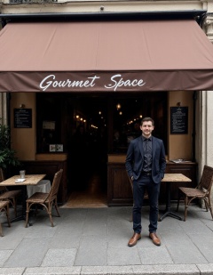 The image shows a person standing on a sidewalk in front of a cafe or restaurant entrance. The establishment has a brown awning with white lettering that reads "Gourmet Space"
