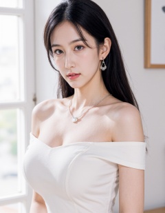 1girl, solo, long hair, dress, jewelry, earrings, white dress, realistic, black hair, breasts, looking at viewer, indoors, photorealistic, upper body, gray eyes, lips, see-through, medium breasts, window, closed mouth, nose, cleavage