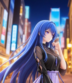 1girl,masterpiece,high quality,best quality,beautiful,upper body,light purple skirt,black shirt,very long hair,blue hair,city street,night,