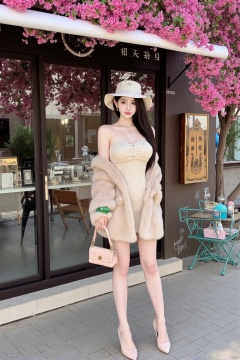 Realistic photo, a young woman, long flowing hair, fair skin, big breasts, fashionable hat, off-shoulder dress, mink coat, wearing a green jade bracelet on her right hand, holding a pink leather bag in her left hand , long legs, high heels, whole body, coffee shop entrance, tables and chairs, trees full of pink flowers,