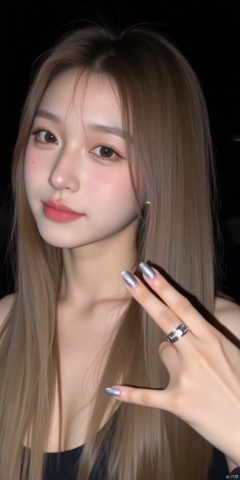 Her right hand is adorned with a silver nail polish and a silver ring. She is facing the camera,