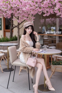 Realistic photo, a young woman, long flowing hair, fair skin, big breasts, fashionable hat, off-shoulder dress, mink coat, wearing a green jade bracelet on her right hand, holding a pink leather bag in her left hand , long legs, high heels, full body, sitting, coffee shop entrance, tables and chairs, trees full of pink flowers,