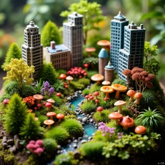 miniature city landscape,Bright plants, mushrooms, miniature landscape, plant, close-up