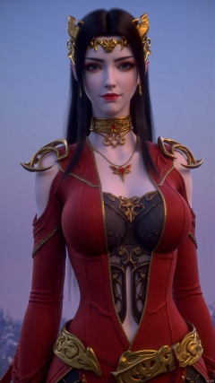She is adorned in an elaborate, fantasy-style outfit that includes a deep red, off-shoulder top with intricate gold detailing around the neckline and sleeves. The top has a plunging V-neckline that reveals a portion of her upper chest. Her lower garment is a matching red, high-waisted skirt with a wide, decorative gold belt. The character also wears a golden headdress with intricate, floral designs, and gold earrings that match the headdress.