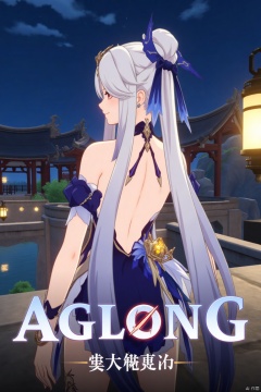 1girl, solo, long hair, very long hair, white hair, bangs, parted bangs, sidelocks, hair ornament, red eyes, looking at viewer, smile, bare shoulders, backless outfit, backless dress, blue dress, official alternate costume, ningguang (genshin impact), ng, standing, looking back, from behind, back, night, night sky, lantern, paper lantern, architecture, east asian architecture, sky, movie poster, three-dimensional text AGlong in the middle below, cinematic lighting, dynamic composition, detailed background with poster theme, high contrast, sharp focus, dramatic atmosphere.
