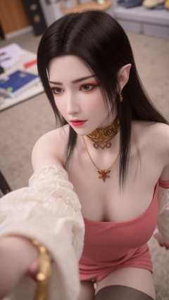 Masterpiece, best quality, high quality, (colorful), small chest, black hair, (long legs: 1.3), (thin legs: 1.3), 1girl, bangs, blurry, blurry_background, blurry_foreground, blush, book, breasts, brown_eyes, closed_mouth, collarbone, depth_of_field, eyebrows_visible_through_hair, long_sleeves, looking_at_viewer, outstretched_arm, selfie, pink skirt, smile, solo, white sweater, thighhighs