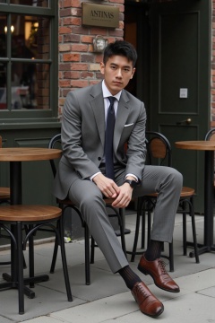 jzns,1man,solo,realistic,male focus,wristwatch, sitting, grey suit,grey pants,black necktie,white shirt,  footwear,black sheer socks, vertical strips socks,brown footwear,cafe, looking at viewer,masterpiece, realistic, best quality, highly detailed,profession,aoinll
