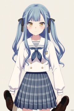 solo,standing,upper_body,togawa sakiko,long hair,bangs,ribbon,hair ribbon,black ribbon,two side up,blue hair,grey hair,sidelocks,blunt bangs,yellow eyes