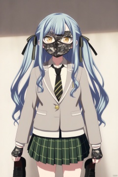 solo,standing,upper_body,togawa sakiko,long hair,bangs,ribbon,hair ribbon,black ribbon,two side up,blue hair,grey hair,sidelocks,blunt bangs,yellow eyes