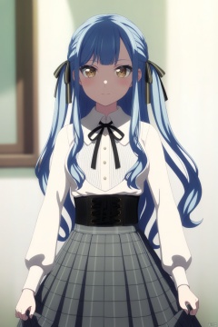 solo,standing,upper_body,togawa sakiko,long hair,bangs,ribbon,hair ribbon,black ribbon,two side up,blue hair,grey hair,sidelocks,blunt bangs,yellow eyes