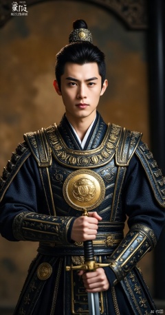 Heroic Portrait: A cinematic shot of a young warrior, clad in ancient Chinese armor, poses proudly against a dramatic backdrop. The framing emphasizes the medal's gleam, suspended from his chest by a thin chain. Soft, warm lighting accentuates the medal's gold hue and the warrior's determined expression. The composition focuses on the medal, emphasizing its significance. The subject stands strong, with one hand resting on the hilt of his sword, ready for battle.