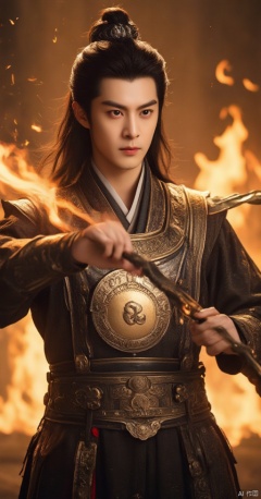 Ancient Chinese young man, wearing ancient armor, burning with flames, a rune composed of golden light is burning, battle scene, movie special effects, epic picture, highest quality, real