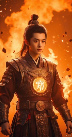 Against a fiery orange-red sky, an ancient Chinese young warrior stands defiantly, clad in intricately adorned armor, as flames engulf his body. A glowing golden rune blazes brightly on his chest, radiating intense light. In the midst of a chaotic battle scene, smoke and debris swirl around him, illuminated by the fiery glow. The air is thick with special effects magic, transporting viewers to an epic, cinematic world of highest quality and realism.