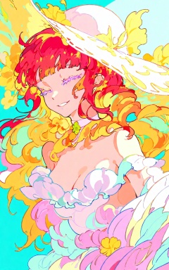 1girl, qk1, solo, flower, closed eyes, dress, long hair, pink flower, bare shoulders, colored eyelashes, frills, colorful, smile, white background, hands up, eyelashes, frilled dress, blunt bangs, red hair, alternate costume, armpit crease, upper body, lips, strapless, breasts, sundress, collarbone, open mouth, hat ornament, green ribbon, sun hat, shade, breasts apart, closed mouth, white choker, ribbon, hat, sidelocks, bare arms, blue background, white dress, teeth, multicolored background, hat flower, medium breasts, white headwear, strapless dress, happy,A young woman with long red hair. the hat has a wide brim and a small bow on the side. the woman is smiling and has her eyes closed, as if she is enjoying the moment. the background is a gradient of blue and yellow, giving the image a dreamy and ethereal feel. the overall color scheme of the image is soft and pastel, with shades of pink, purple, and green.masterpiece, best quality, newest, absurdres, sensitive <lora:okra_v2.5-000029:1>