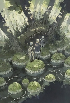 multiple boys, qk2, nature, tree, water, outdoors, moss, forest, holding, standing, rock, sunlight, pants, facing away, blue capelet, boots, riverbank, from behind, shorts, weapon, dappled sunlight, black pants, scenery, wide shot, grass, long sleeves, shield, sword on back, white shirt, kneeling, from above, shirt, day, brown footwear, staff, weapon on back, black hair, capelet,A forest scene. it shows a group of people walking through the woods, with trees and bushes surrounding them. in the center of the image, there is a large tree trunk that appears to be floating above the ground. the tree trunk is covered in moss and rocks, and there are several smaller rocks scattered around the base of the tree. on top of the trunk, there are two people walking side by side, one wearing a blue jacket and the other wearing a brown jacket. there are also several wooden sticks hanging from the tree's branches, which appear to be used as markers or signs. the background shows a small stream running through the forest and some rocks scattered on the ground.masterpiece, best quality, newest, absurdres, safe <lora:okra_v2.5-000030:1>