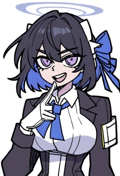 1girl, qk3, halo, black hair, gloves, solo, white gloves, arm behind back, short hair, index finger raised, smile, angel, open mouth, breasts, shirt, purple eyes, cross, ribbon, eyebrows hidden by hair, sidelocks, finger to mouth, headgear, looking at viewer, collared shirt, teeth, :d, blue neckwear, blue ribbon, black jacket, hair between eyes, jacket, long sleeves, white background, large breasts, buttons, hand on own chest, blush, simple background, upper body, mechanical halo,an illustration by the artist yamoge, known for their distinctive style in character design and vibrant colors. The artwork features a young girl with long black hair that partially covers her face, which is highlighted by a pair of blue ribbons tied into bows on her head. She has striking purple eyes and appears to be looking directly at the viewer with an open-mouth expression. The background is simple and white, ensuring that the focus remains on the character. This piece seems to be part of the "Blue Archive" series or project related to "Blue Archive," possibly depicting characters from this popular anime or manga universe.masterpiece, best quality, newest, absurdres, safe <lora:okra_v2.5-000030:1>