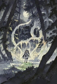 qk2, plant, from above, ghost, gloves, nature, walking, hood, spirit, standing on branch, night sky, scenery, sword, moon, pink hair, lantern, sky, weapon, jacket, grass, vines, from behind, light particles, rock, night, ambiguous gender, shorts, moonlight greatsword, outdoors, cloudy sky, forest, sunrise, tree stump, pine tree, standing, leaf umbrella,A mystical scene in a dark and eerie forest. the background is filled with tall trees and shrubs, and there are two lanterns on either side of the path leading to a cave entrance. in the center of the image, there is a large white dragon-like creature with long wings spread out behind it. the creature appears to be glowing orange and yellow, and its body is covered in intricate patterns and designs. they appear to be looking at the dragon with awe and wonder. the overall mood of the illustration is dark and mysterious, with a sense of mystery and intrigue.masterpiece, best quality, newest, absurdres, safe <lora:okra_v2.5-000030:1>