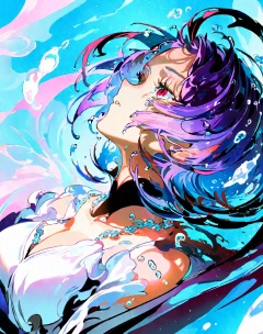1girl, qk1, solo, parted lips, looking up, necklace, purple hair, jewelry, short hair, floating hair, makeup, blue background, tears, upper body, crying, water, feathers, hands up, nose blush, cloud, sky, star \(sky\), collarbone, gradient sky, large breasts, cleavage, streaming tears, eyeshadow, turtleneck, wet hair, shirt, starry sky, wet clothes, orange sky, bare shoulders, looking away, eyeliner, long sleeves, crystal necklace, pink eyeshadow, breasts, parted bangs, water drop, feather trim, white shirt, cloudy sky, blush,A young woman with dark hair and red eyes. she is wearing a black choker necklace and has her arms stretched out to the sides, as if she is reaching for something. the background is a blue sky with small white bubbles scattered around. the woman appears to be in a dream-like state, with her eyes closed and a peaceful expression on her face. the overall mood of the image is surreal and dreamlike.masterpiece, best quality, newest, absurdres, sensitive <lora:okra_v2.5-000030:1>