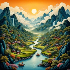 water fall,,,国画,Traditional Chinese Painting,Dot Matrix Hologram,vivid color,(Chinese traditional painting:1.1),rice paddy,water Country scene,light particles,bokeh,glowing 3D objects,no coral,characters,children,live streets,carriages,Guanyin in the sky,dragon,