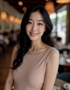 This is a  beautiful photograph of a woman, black hair cascading over her shoulders. She is wearing a boatneck dress, Standing in a cafe. Looking at the viewer. Smile.