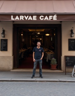 The image shows a man standing on a sidewalk in front of a cafe or restaurant entrance. The establishment has a brown awning with white lettering that reads "𝐿𝐴𝑅𝑉𝐴𝐸 𝐶𝐴𝐹𝐸"