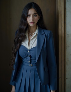 HDR photo of cinematic film still, 1girl, small mouth, solo, large breasts, long hair, jewelry, necklace, long sleeve dress, blue suit, white collared shirt, pleated dress, short skirt, looking at viewer, dress, pale skin, full body,