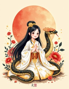 CCNY,chinese ink painting style,splashed ink,line drawing illustrations,2d flat design,anime art,high contrast shadows,strong lines and shapes,This is a girl taken with a full shot,she wearing a white hanfu with intricate gold patterns and designs,New Year's greeting posture with both hands,she has long black hair with a gold flower on her head,She smilling and looking at the camera,Behind her is a cute golden and black snake,It has red patterns on its forehead and It stuck out its red tongue and looking at the camera with round clear eyes,Their bodies is covered in yellow and gold splatters,There are many dark red flowers and dark yellow leaves around them,the background is light yellow,There is a red graffiti arc in the middle of the image,and a large amount of splattered golden and black paint and ink painting like smearing and fluid,