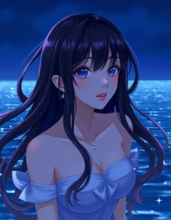 ((4k,masterpiece,best quality)),professional camera,8k photos,wallpaper,1girl,solo,long hair,black hair,(dress:1.3),bare shoulders,jewelry,eyes,earrings,outdoors,sky,sparkle_water,necklace,dress,lips,sparkle,night,floating hair,wind,red lips,Seaside,sea,blue water,glowing water,rippling water,yuechan,purple hair,