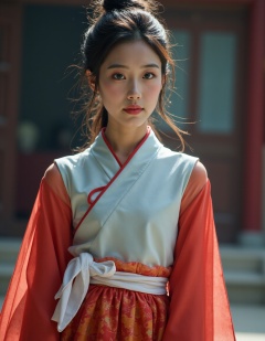 HDR photo of cinematic film still, teenage,chinese girl,full body,realistic,blue dress,looking at viewer,simple white top with red edge, gradient red sleeves, patterned red and orange skirt, white sash