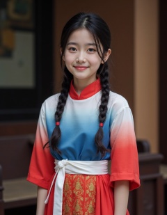 HDR photo of cinematic film still, teenage,chinese girl,full body,realistic,blue dress,looking at viewer,simple white top with red edge, gradient red sleeves, patterned red and orange skirt, white sash