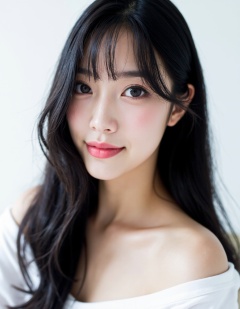 masterpiece,best quality,a Chinese young girl,smile,white background,black hair,long bob hair,face front,close-up:1,studio light,studio,side light,makeup portrait,wear white top,
