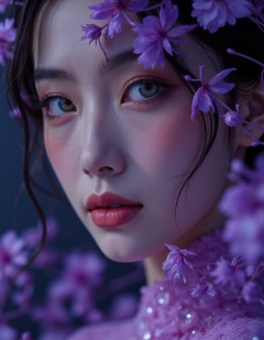 cinematic photo official art,ultra detailed,aesthetic,masterpiece,best quality,photorealistic,entangle,purple rose,tangle,entangle,1girl,chinese woman,Glowing eyes,tears,Golden eyeshadows,ecstasy of flower,dynamic angle,the most beautiful form of chaos,elegant,a brutalist designed,Gradient colours,romanticism,film,professional,highly detailed,skin detail realistic,Glass fragments,Shimmering Crysta,looking at viewer,makeup portrait,purple eyeshadows,