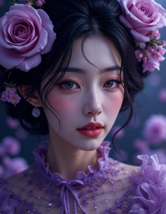 cinematic photo official art,ultra detailed,aesthetic,masterpiece,best quality,photorealistic,entangle,purple rose,tangle,entangle,1girl,chinese woman,Glowing eyes,tears,Golden eyeshadows,ecstasy of flower,dynamic angle