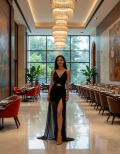 This is a beautiful photograph of a black hair woman,full body, smirk, Hotel interior space,modern luxury design,high ceilings,marble flooring,large windows,abundant natural light,elegant chandeliers,combination of contemporary and classic furniture,wall murals with traditional art,spacious dining area with long tables,arrangement of potted plants,neutral color palette with accents of green and red,sophisticated and inviting atmosphere,symmetry in layout,view of glass exterior wall showcasing greenery outside,balanced composition with central perspective,inviting and upscale ambiance.,