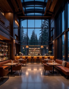 Modern hotel bar interior, open-plan layout, glass and metal structures, warm wood and leather materials, plush seating with brown leather chairs, illuminated bottle display behind the bar, contemporary pendant lighting, large windows with outdoor view, forest landscape visible outside, evening atmosphere, cool color tone with warm lighting accents, symmetrical composition, sophisticated and luxurious ambiance, casual yet elegant seating arrangement, polished stone flooring, strategic architectural lighting enhancing the space.