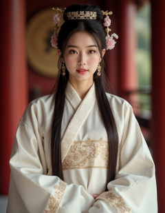 Portrait realistic photography under the sense of atmosphere,in the gorgeous palace,martial arts style,cool Chinese beauty,long hair,gorgeous hair accessories,white gorgeous robes,golden patterns on clothes,whole body,