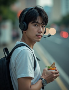 HDR photo of cinematic film still 1boy,male focus,headset,black hair,solo,bag,shirt,watch,holding food,white shirt,backpack,wristwatch,upper body,realistic,looking at viewer,short sleeves,holding,black eyes,day,short hair, . shallow depth of field, vignette, highly detailed, high budget, bokeh, cinemascope, moody, epic, gorgeous, film grain, grainy . High dynamic range, vivid, rich details, clear shadows and highlights, realistic, intense, enhanced contrast, highly detailed