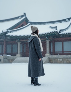 a woman standing in front of a building in the snow with a coat on and a hat on her head, An Gyeon, snow, a statue, aestheticism
