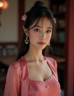 HDR photo of cinematic film still 1girl, solo, dress, long hair, hair ornament, chinese clothes, jewelry, earrings, realistic, pink dress, looking at viewer, sash, waist up, chinese dress, brown hair, parted lips, black hair, cleavage, long sleeves, . shallow depth of field, vignette, highly detailed, high budget, bokeh, cinemascope, moody, epic, gorgeous, film grain, grainy . High dynamic range, vivid, rich details, clear shadows and highlights, realistic, intense, enhanced contrast, highly detailed