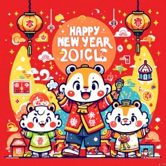 chunjieflux, a New Year-style cartoon character New Year greeting illustration poster,containing traditional Chinese elements,auspicious clouds,lantern/lamp,chinese_knot,fireworks,firecrackers,red envelopes,stickers,Spring Festival couplets and other elements,red background,vivid images,mascots,New Year greetings,in a colorful background full of abstract shapes,