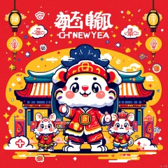 chunjieflux, a New Year-style cartoon character New Year greeting illustration poster,containing traditional Chinese elements,auspicious clouds,lantern/lamp,chinese_knot,fireworks,firecrackers,red envelopes,stickers,Spring Festival couplets and other elements,red background,vivid images,mascots,New Year greetings,in a colorful background full of abstract shapes,