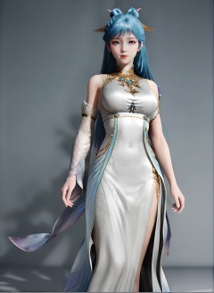 fair_skin,white_skin,Ivory_skin,score_9,<lora:SF_WangDongEr_Pony_Realism-000004:0.7>,hair ornament,dress,china dress,blue hair,1girl,breasts,large breasts,standing,detached sleeves,solo,looking at viewer,simple background,
