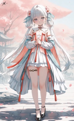 masterpiece,best quality,high quality,loli,chromatic aberration,fair_skin,artist: wlop,artist:chen_bin,[[artist:ke-ta]],artist: hitenkei,good work, (best quality), illustration, depth of field, (color),masterpiece,best quality,petite,cute,loli, kawaii,1girl, solo, long hair, looking at viewer, bangs, hair ornament, long sleeves, dress, ribbon, bare shoulders, twintails, very long hair, standing, full body, flower, white hair, parted lips, hair flower, high heels, petals, thigh strap, chinese clothes, tassel,jinhsi