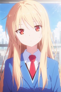 1girl,solo,long hair,blonde hair,shirt,red eyes,red necktie,school uniform,expressionless eyes,expressionless,head tilt,on the bed,Indoor,Window,city,Sunshine,