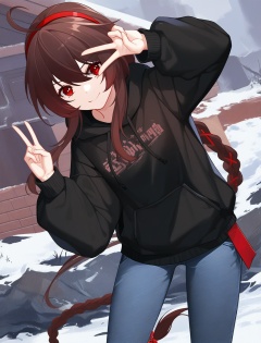 yuezheng ling,1girl,masterpiece,high quality,best quality,beautiful,v,snowy moutain,standing,hoodie,jeans,