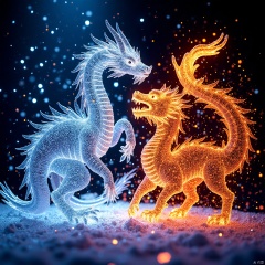Ice and fire elements, strange beasts,光影,light and shadow