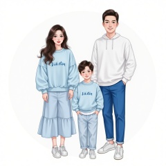 Family photo,mom and dad a son,a girl,wearing light blue line of clothes,all wearing sneakers,