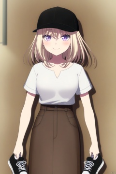 skirt,shirt,hat,white shirt,short sleeves,shoes,socks,black footwear,black headwear,white socks,casual,sneakers,baseball cap,long skirt,brown skirt,shirt tucked in,medium skirt