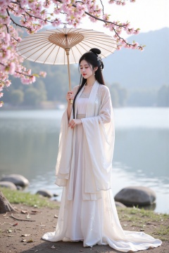 In the distance, a beautiful woman stands alone. She dressed in white brocade, waist graceful, hair such as a waterfall, only with a sheep fat hosta pine pull on. The West Lake silk umbrella painted with ink bamboo in the hand, slightly inclined, seems to undertake this boundless melancholy.